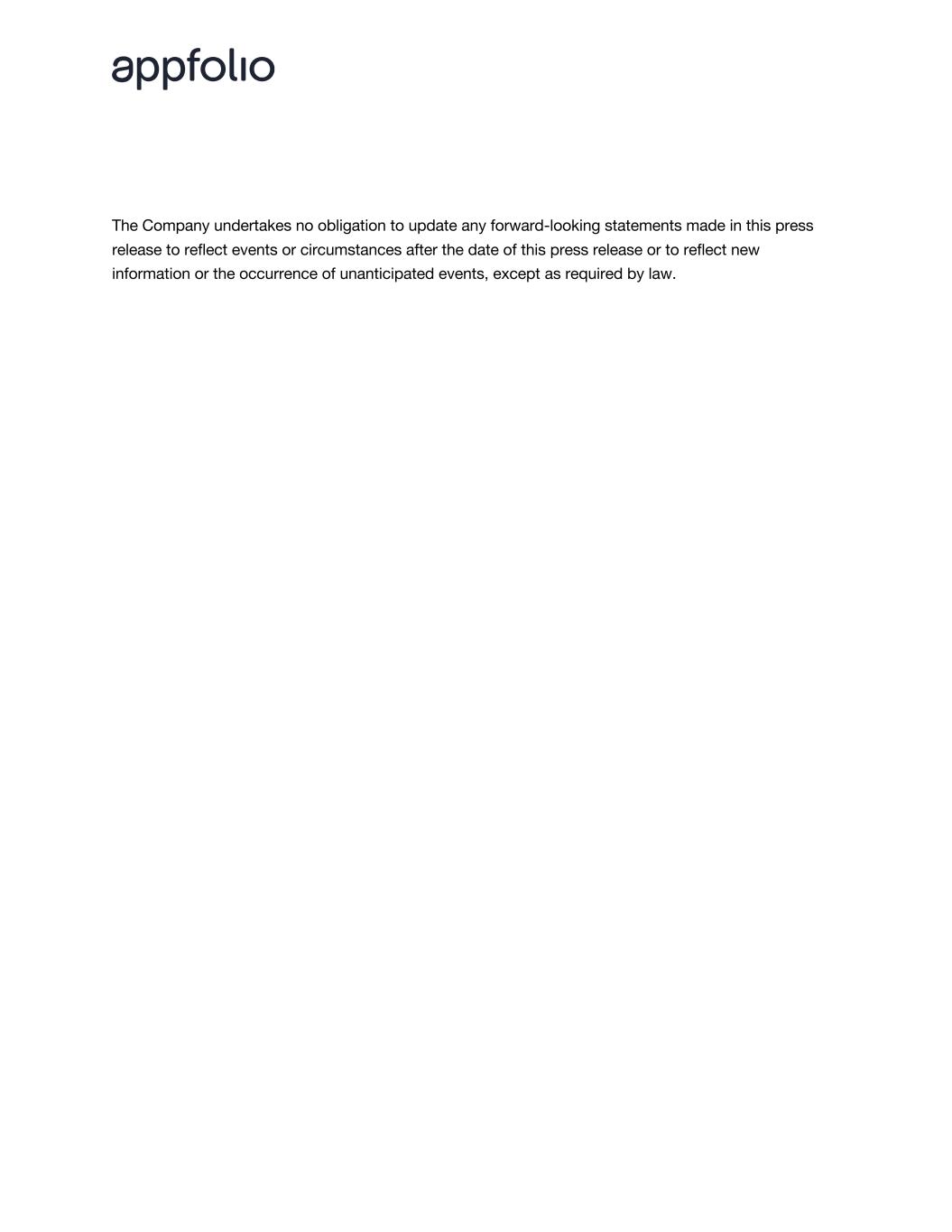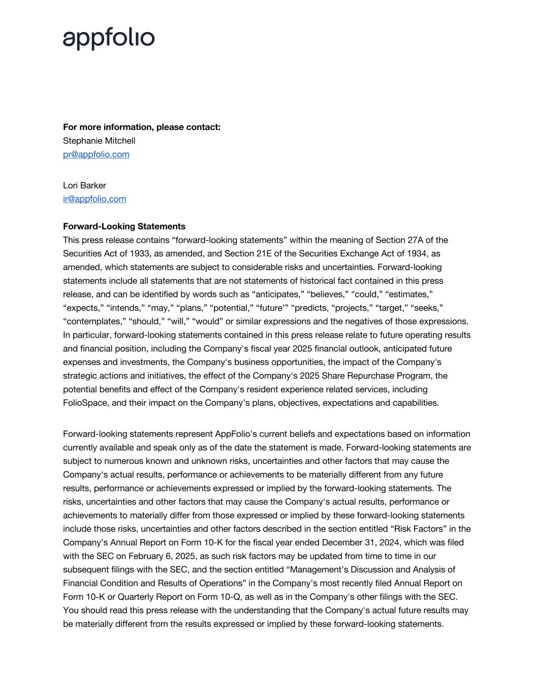 For more information, please contact: Stephanie Mitchell pr@appfolio.com Lori Barker ir@appfolio.com Forward-Looking Statements This press release contains “forward-looking statements” within the meaning of Section 27A of the Securities Act of 1933, as amended, and Section 21E of the Securities Exchange Act of 1934, as amended, which statements are subject to considerable risks and uncertainties. Forward-looking statements include all statements that are not statements of historical fact contained in this press release, and can be identified by words such as “anticipates,” “believes,” “could,” “estimates,” “expects,” “intends,” “may,” “plans,” “potential,” “future’” “predicts, “projects,” “target,” “seeks,” “contemplates,” “should,” “will,” “would” or similar expressions and the negatives of those expressions. In particular, forward-looking statements contained in this press release relate to future operating results and financial position, including the Company's fiscal year 2025 financial outlook, anticipated future expenses and investments, the Company's business opportunities, the impact of the Company's strategic actions and initiatives, the effect of the Company's 2025 Share Repurchase Program, the potential benefits and effect of the Company's resident experience related services, including FolioSpace, and their impact on the Company’s plans, objectives, expectations and capabilities. Forward-looking statements represent AppFolio's current beliefs and expectations based on information currently available and speak only as of the date the statement is made. Forward-looking statements are subject to numerous known and unknown risks, uncertainties and other factors that may cause the Company's actual results, performance or achievements to be materially different from any future results, performance or achievements expressed or implied by the forward-looking statements. The risks, uncertainties and other factors that may cause the Company's actual results, performance or achievements to materially differ from those expressed or implied by these forward-looking statements include those risks, uncertainties and other factors described in the section entitled “Risk Factors” in the Company’s Annual Report on Form 10-K for the fiscal year ended December 31, 2024, which was filed with the SEC on February 6, 2025, as such risk factors may be updated from time to time in our subsequent filings with the SEC, and the section entitled “Management’s Discussion and Analysis of Financial Condition and Results of Operations” in the Company’s most recently filed Annual Report on Form 10-K or Quarterly Report on Form 10-Q, as well as in the Company's other filings with the SEC. You should read this press release with the understanding that the Company's actual future results may be materially different from the results expressed or implied by these forward-looking statements.